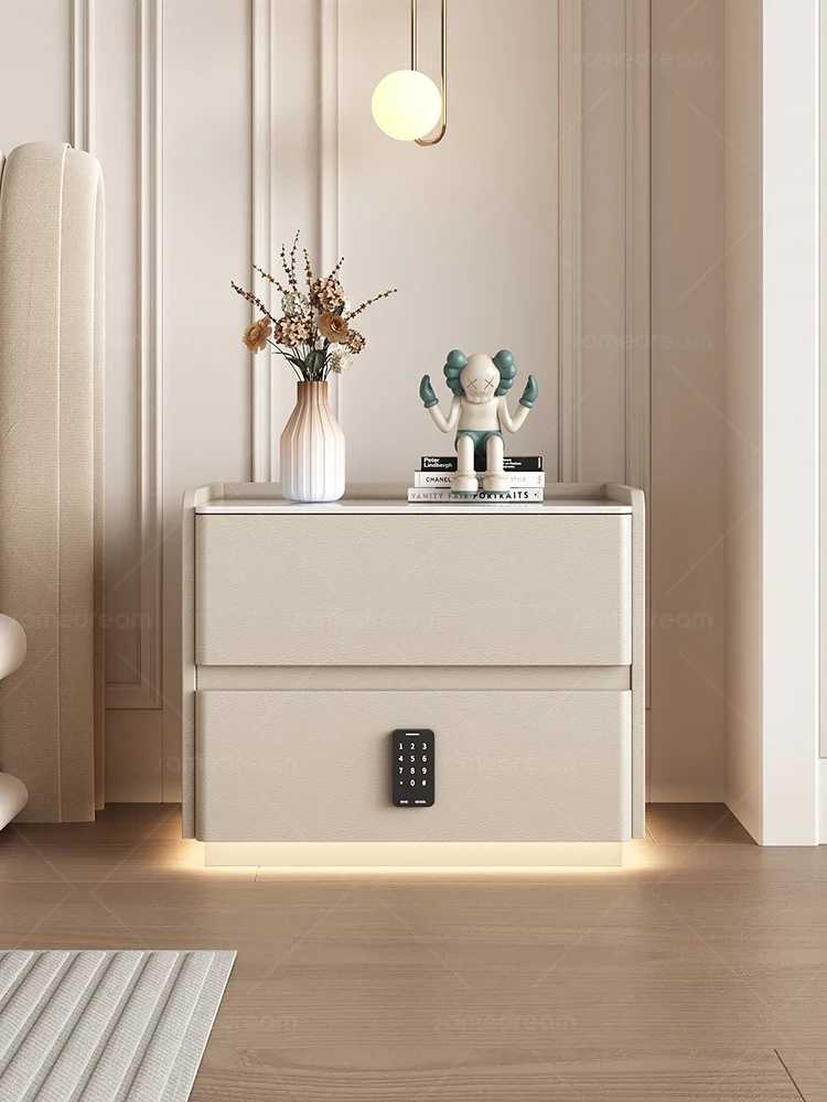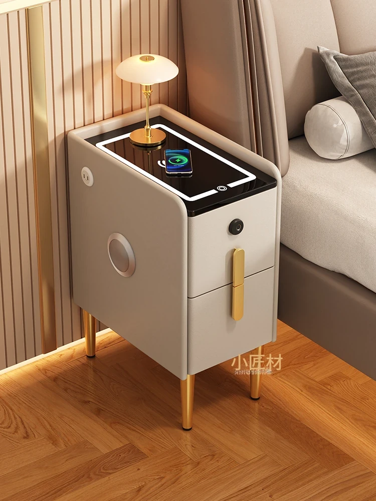 高級感溢れる本革仕上げ!充電機能付きスマートナイトテーブル - セキュリティボックス付きで安心・快適な眠りをサポート!