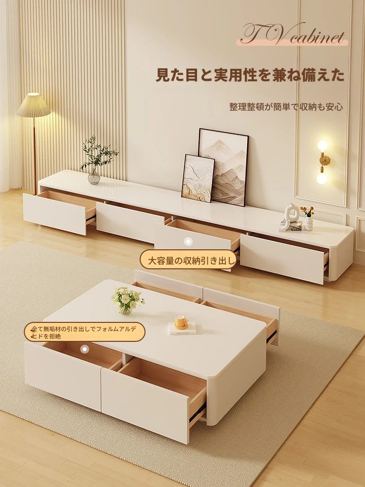 リビングにぴったり!クリーム風のデザインと岩板が融合したスタイリッシュなローボード - 家庭の魅力を引き立てる完璧な収納ソリューション!