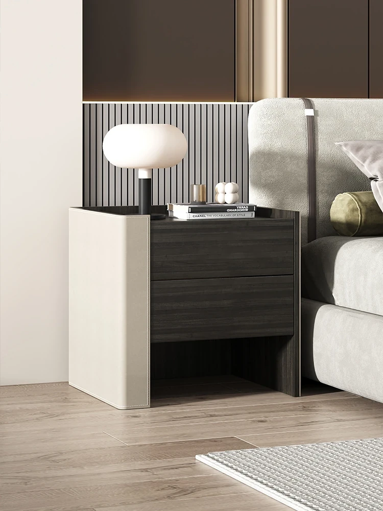 サドルレザーのベッドサイドキャビネット|高級感あふれる無垢材製|2024年新作|シンプルでモダンなデザインのコンパクトキャビネット|おしゃれな収納で快適な寝室を演出!