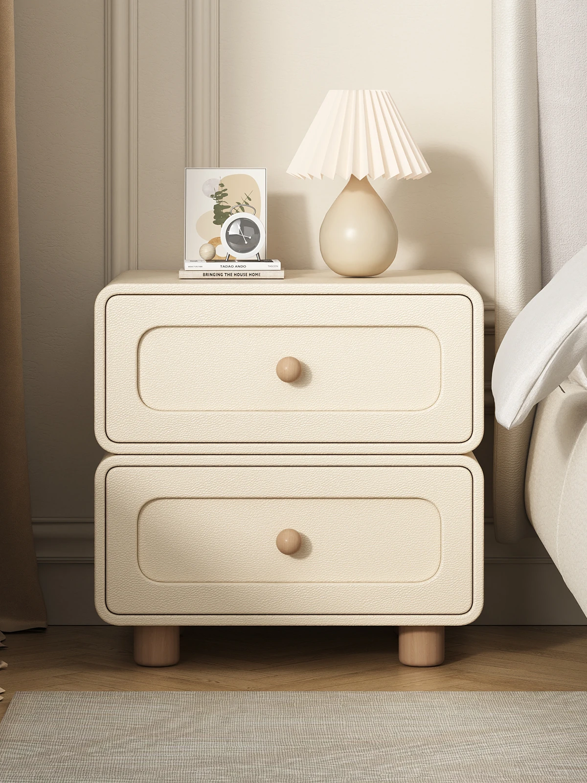 クリーム風の収納付き無垢材ベッドサイドテーブル - シンプルでモダンなデザイン、リビングや寝室にぴったりな軽奢小型キャビネット。おしゃれで使いやすい、心地よい空間を演出します。