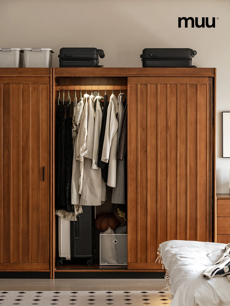 MUU Solid Wood Sliding Door Wardrobe - Simple Vintage Bedroom Storage Cabinet with Pull-Out Doors, Perfect for Organizing Clothes in Your Home