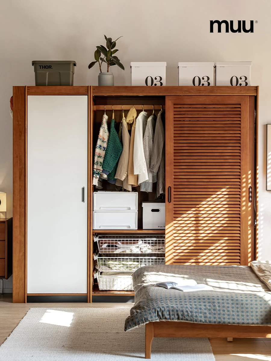 MUU Retro Solid Wood Wardrobe with Sliding Doors - Scandinavian Japanese Style Storage Cabinet for Small Bedrooms - Space-Saving Home Closet Solutions