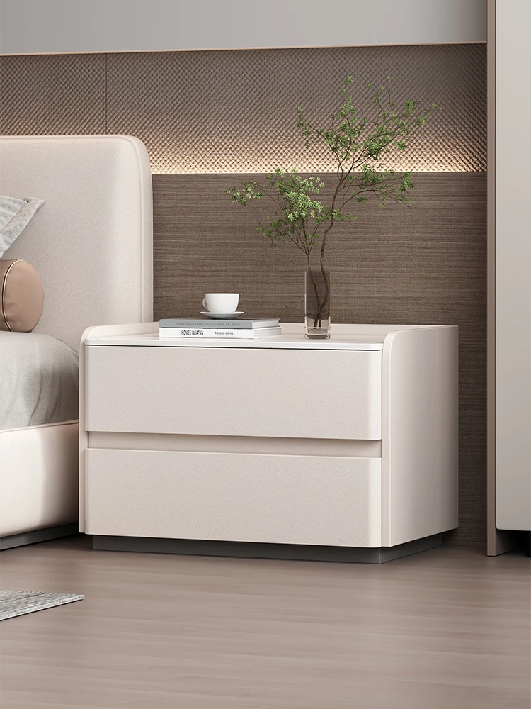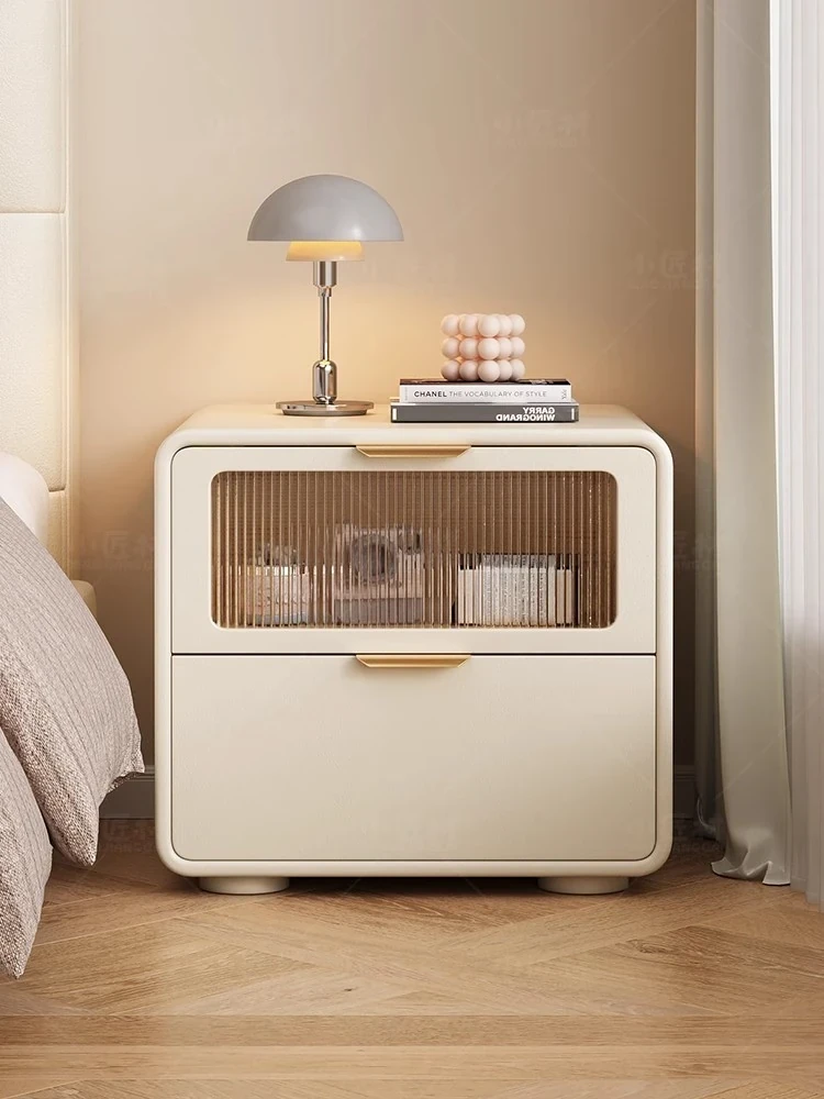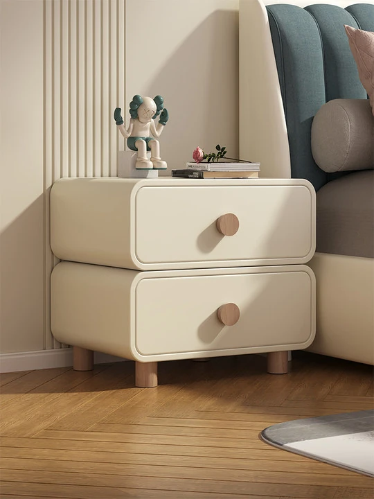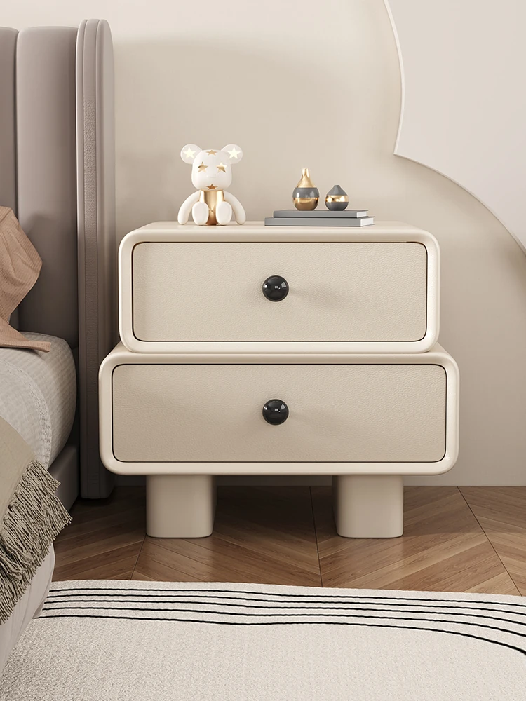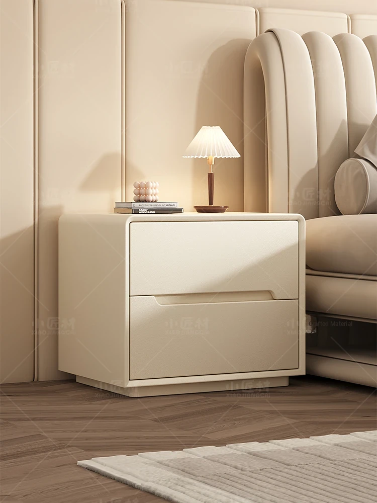 "Modern Minimalist Cream Wood Nightstand – Trendy Leather Bedside Cabinet for Easy Bedroom Storage and Organization"