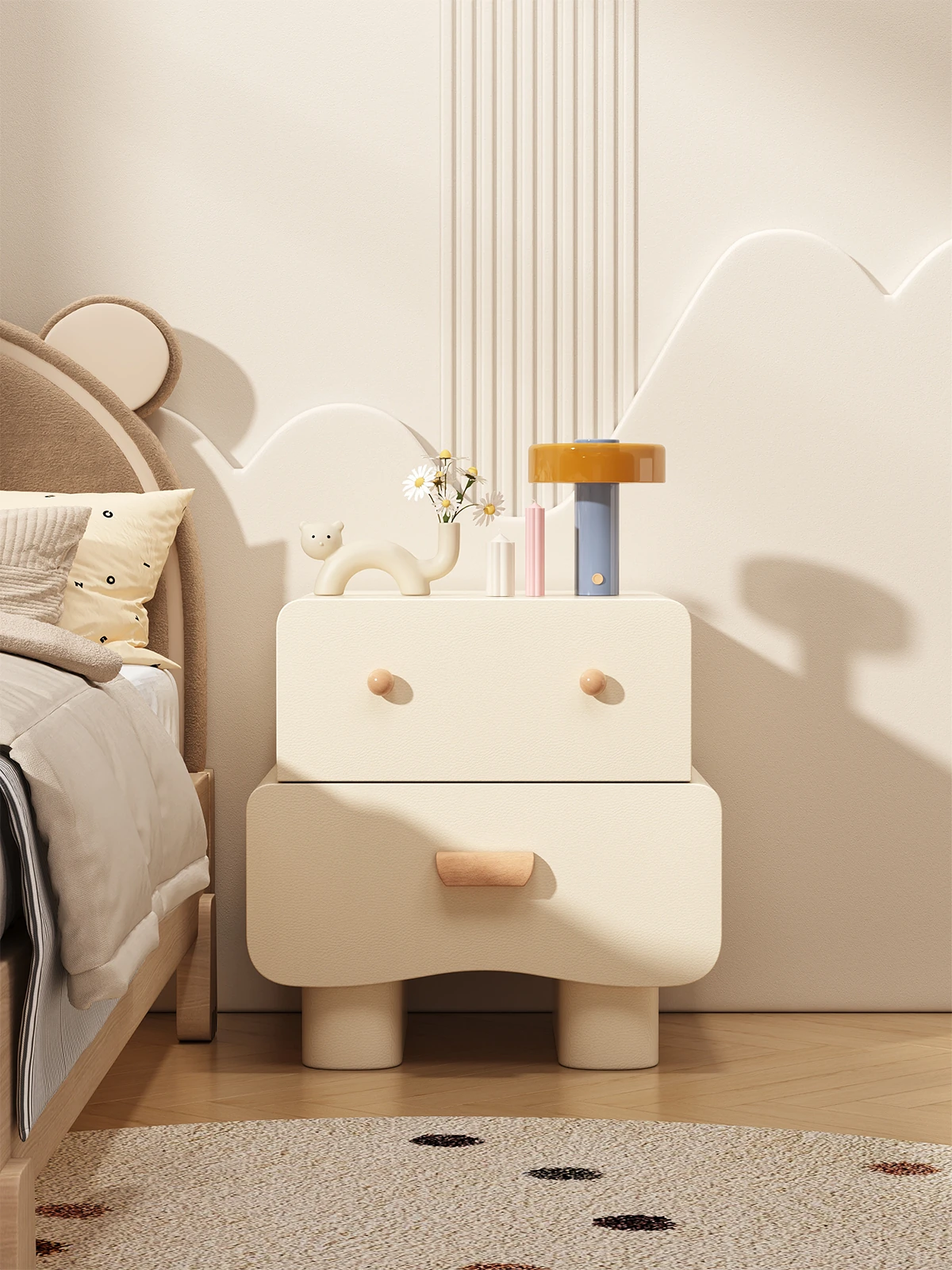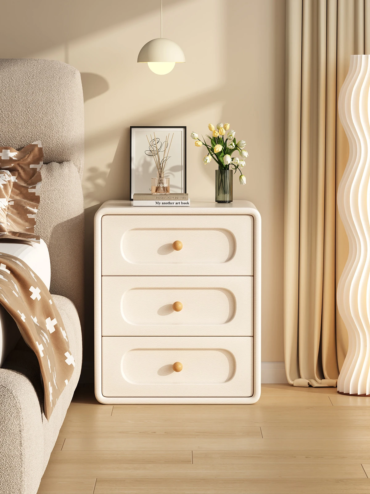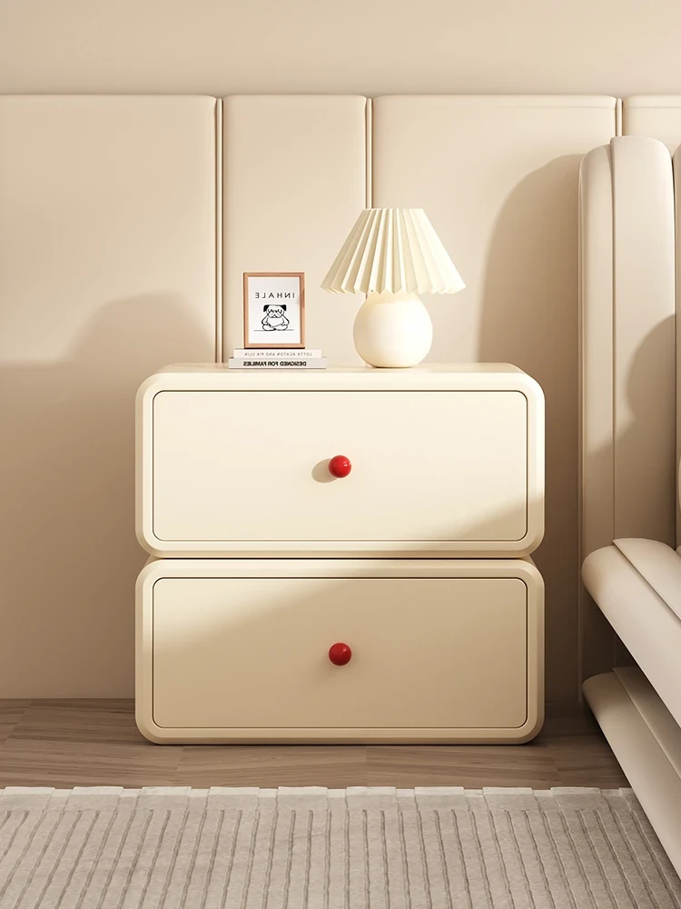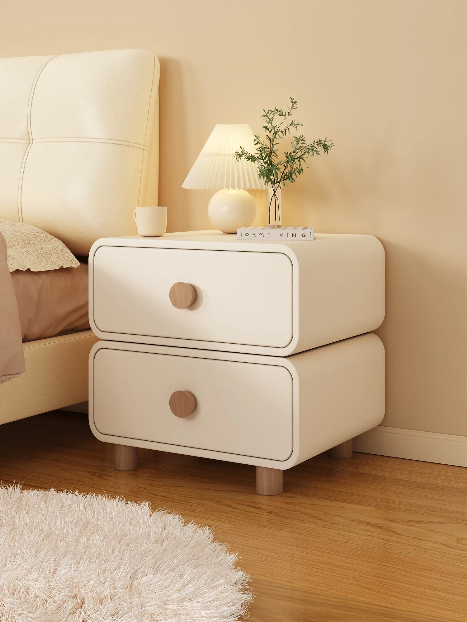 "Modern Minimalist Cream Wood Nightstand – Trendy Leather Bedside Cabinet for Easy Bedroom Storage and Organization"