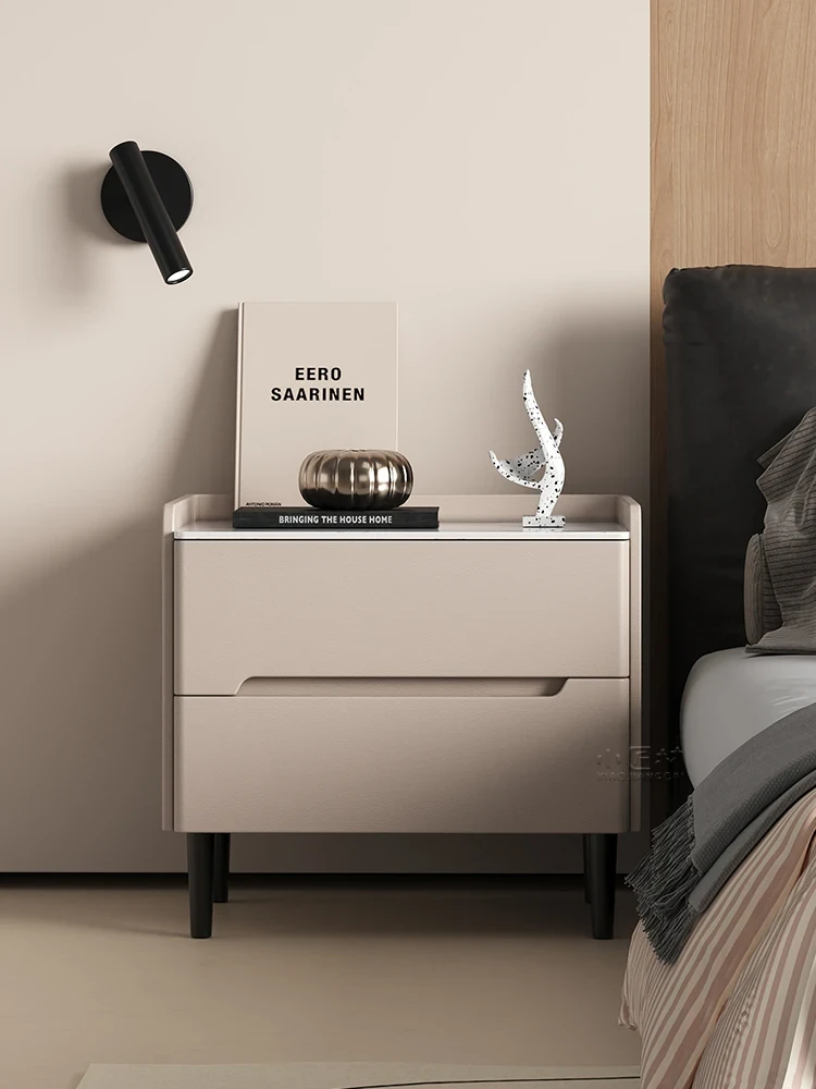 Solid Wood Modern Minimalist Lacquered Nightstand with Rock Slab Top – A Stylish Addition to Your Bedroom Decor!
