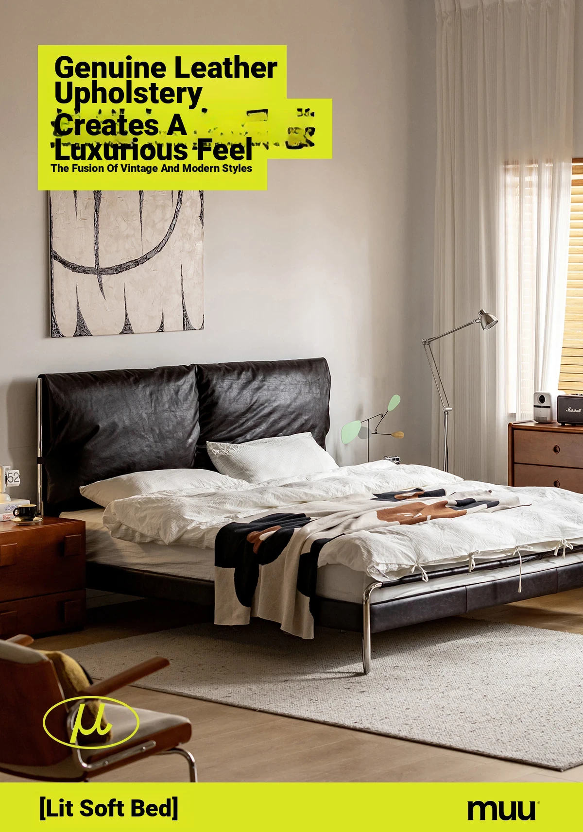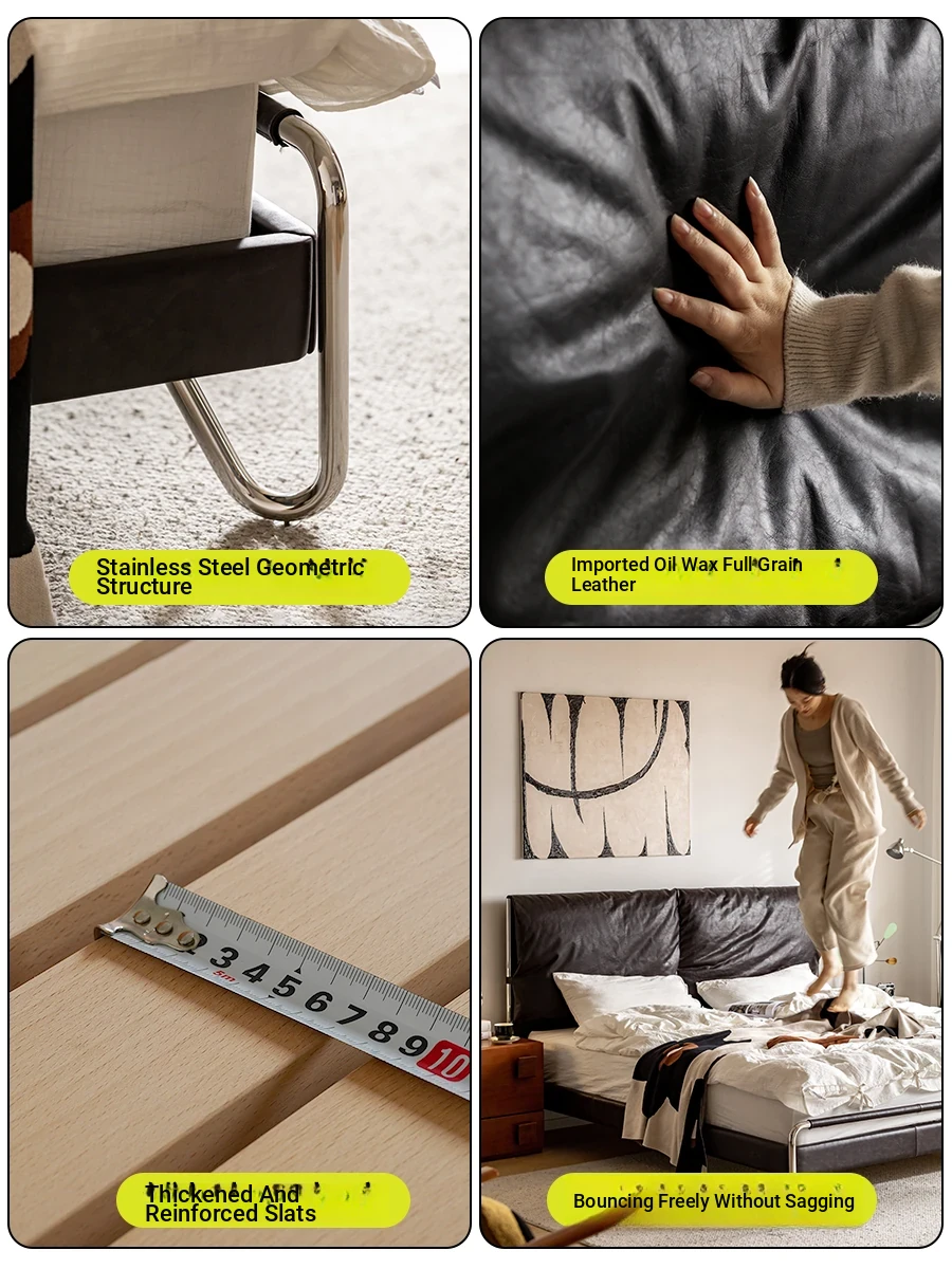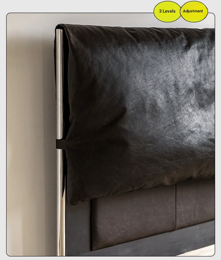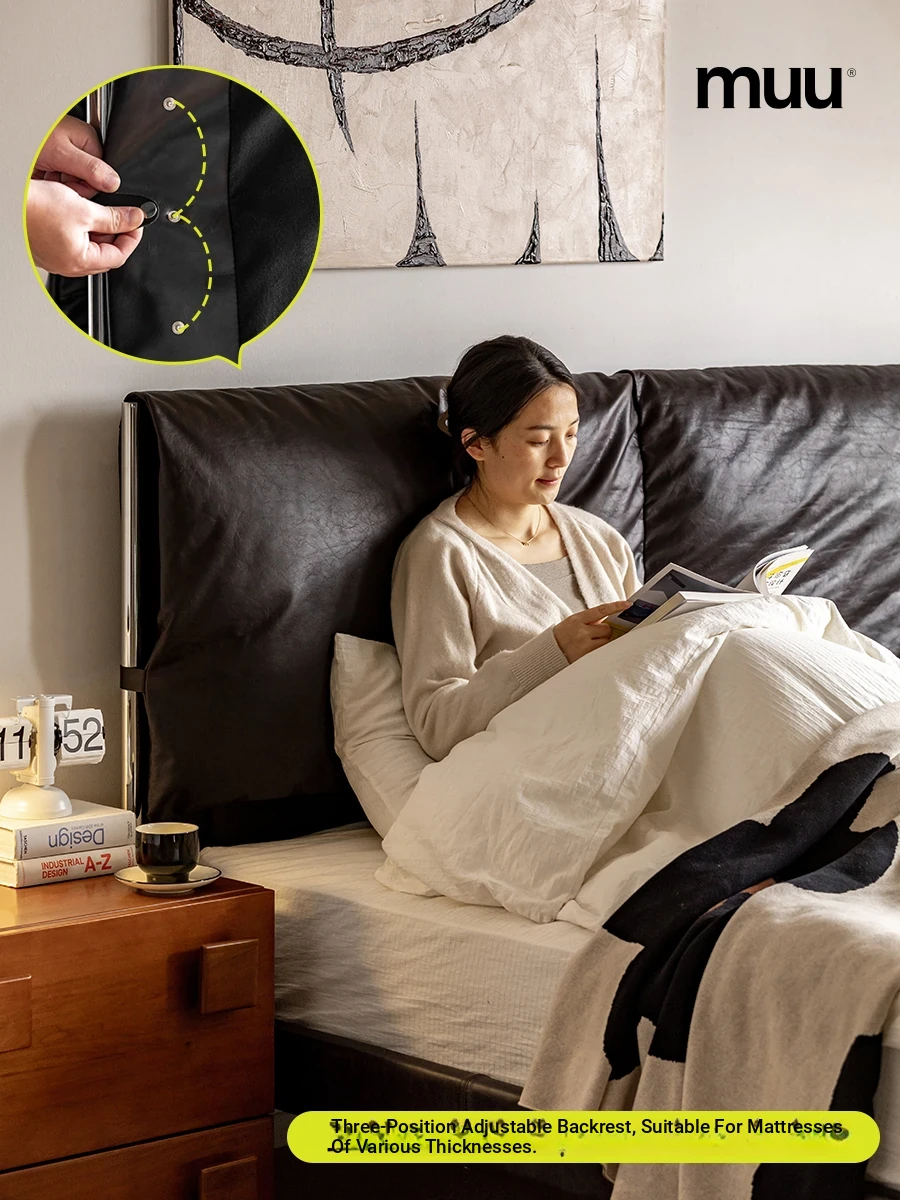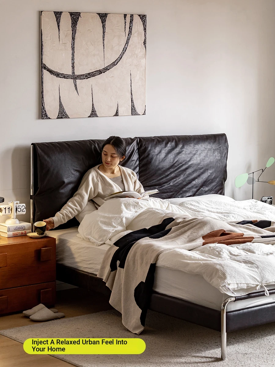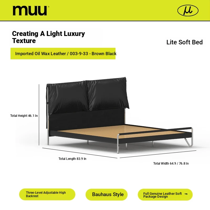 MUU Genuine Leather French Vintage Black Master Bedroom Bed - 1.8m Soft-Padded Double Bed in Top-Grade Cowhide, Modern Minimalist Italian Design